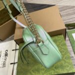 The GG Marmont series showcases exquisite leather with fresh tones, showcasing the charm and style of early autumn. This small shoulder bag is crafted with stitched V-shaped leather, adorned with zipper closures, and features light gold colored accessories that complement the fashionable light blue silhouette. Light blue quilted V-shaped leather, light blue leather rolled edges, light gold toned accessories, light blue mulberry silk lining double G, open inner pocket, adjustable chain shoulder strap (60cm high). It can also be used as a crossbody bag. Zipper opening and closing, with extended zipper head x weight: approximately 0.394 kilograms.