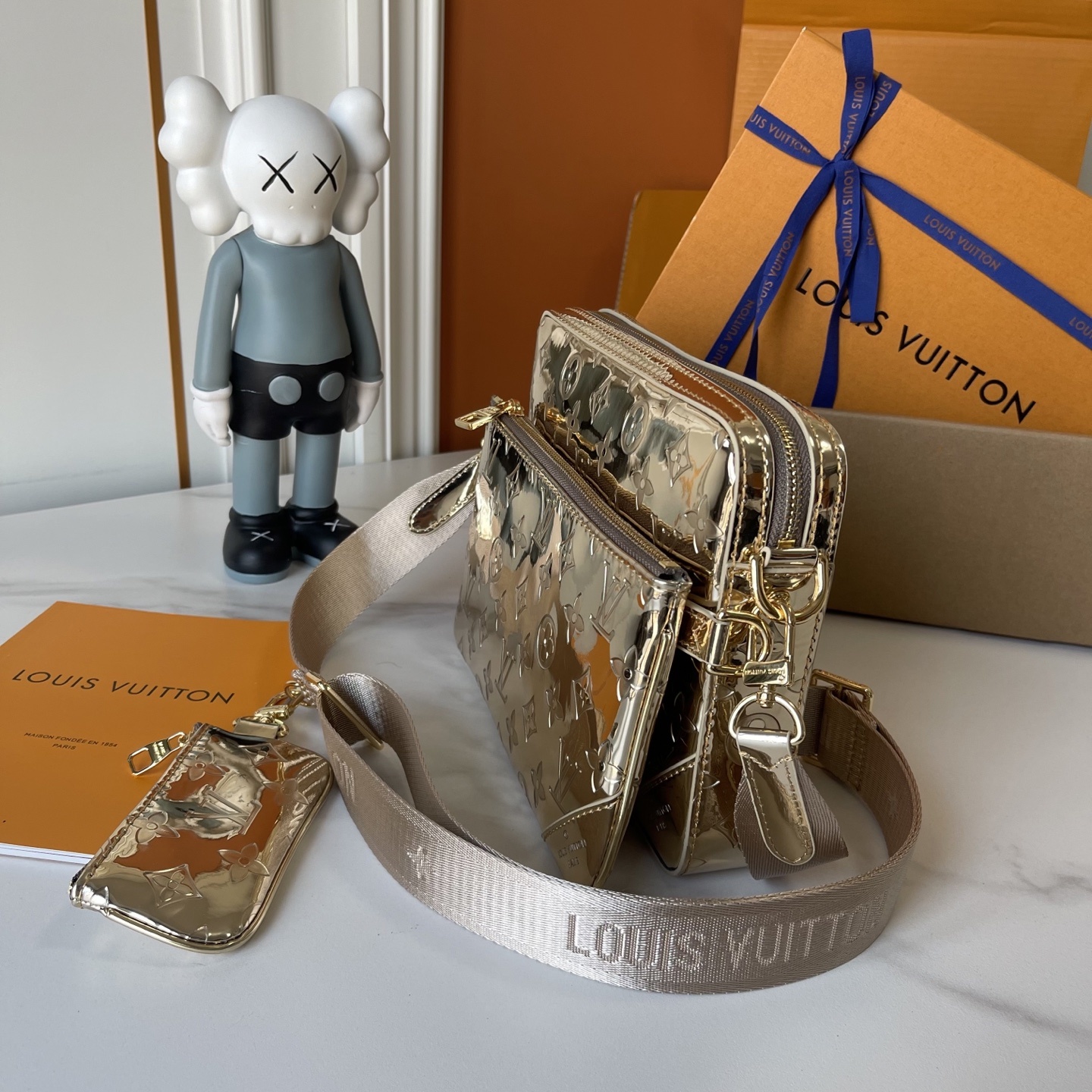 The upgraded M69443 Trio messenger bag comes from the LV Ski series, featuring embossed coated canvas embellished with smooth leather trim and shiny metal pieces, and a brand new Monogram Miroir effect to declare the retro futuristic concept. The change bag at the zipper front pocket and shoulder strap are both detachable, enriching the functional design together with the main pocket. Adjustable and detachable fabric shoulder straps adorned with Louis Vuitton logo, providing a comfortable shoulder and back experience.